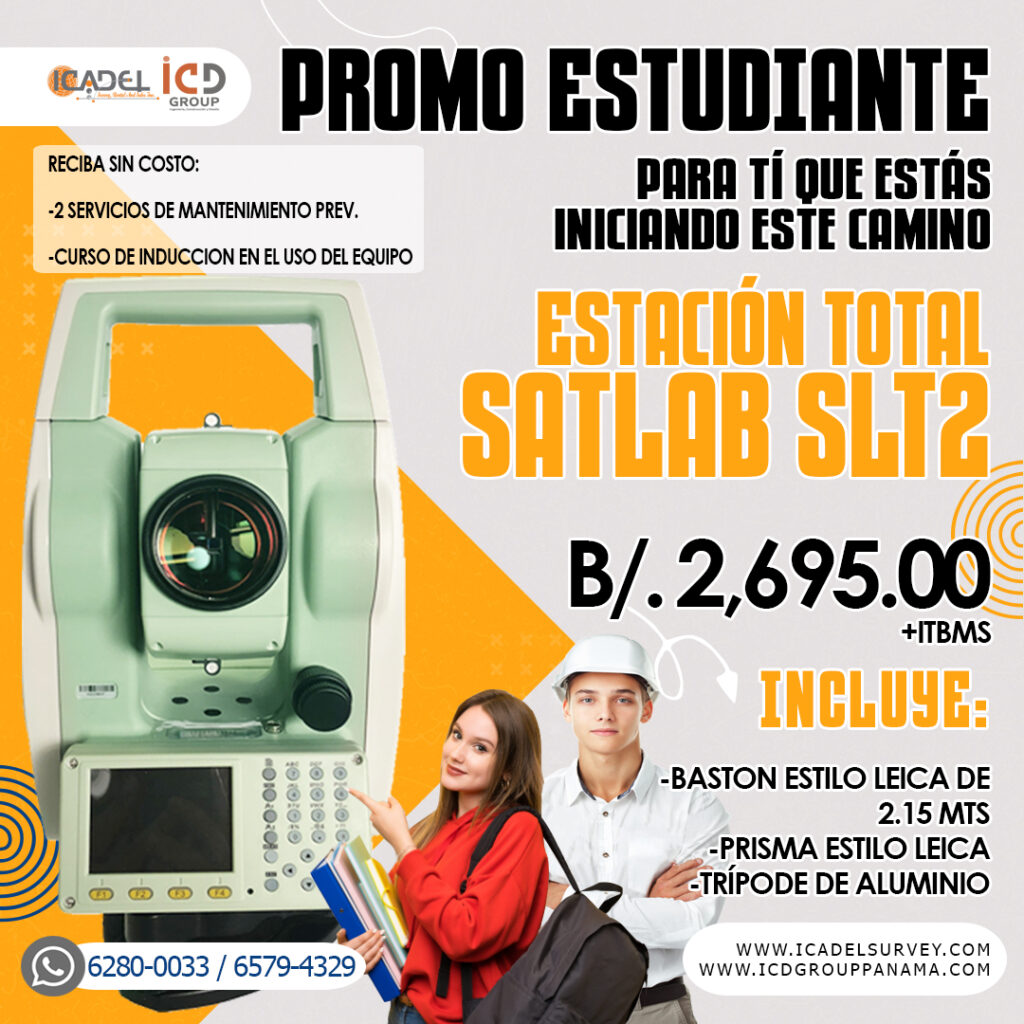 La promoción ofrece la estación total SATLAB SLT2 a un precio especial de B/. 2,695.00 + ITBMS, acompañada de beneficios adicionales que aportan valor a la inversión: